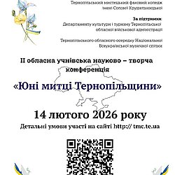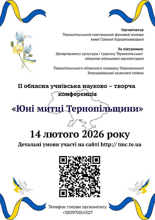14 лютого 2026 року у Тернопільському мистецькому фаховому коледжі імені Соломії Крушельницької відбудеться ІІ обласна учнівська науково-творча конференція "ЮНІ МИТЦІ ТЕРНОПІЛЬЩИНИ". До участі в конференції запрошуються учні мистецьких та музичних шкіл м. Тернополя та Тернопільської області.
