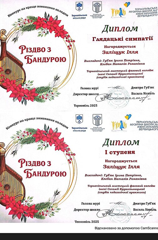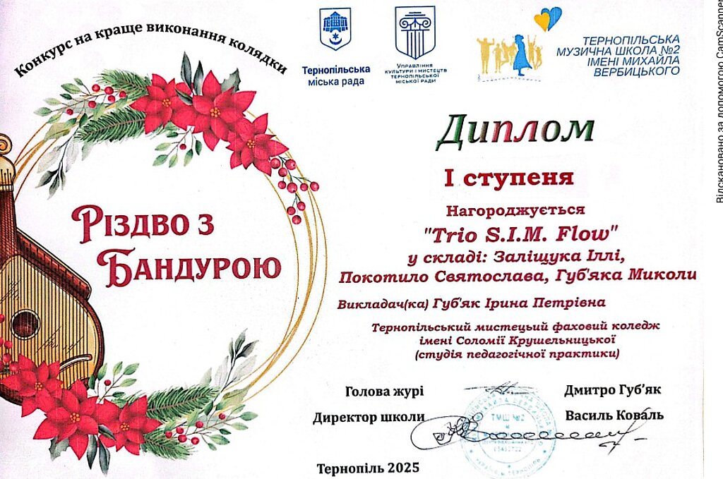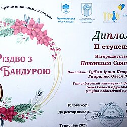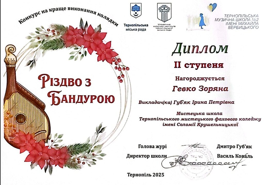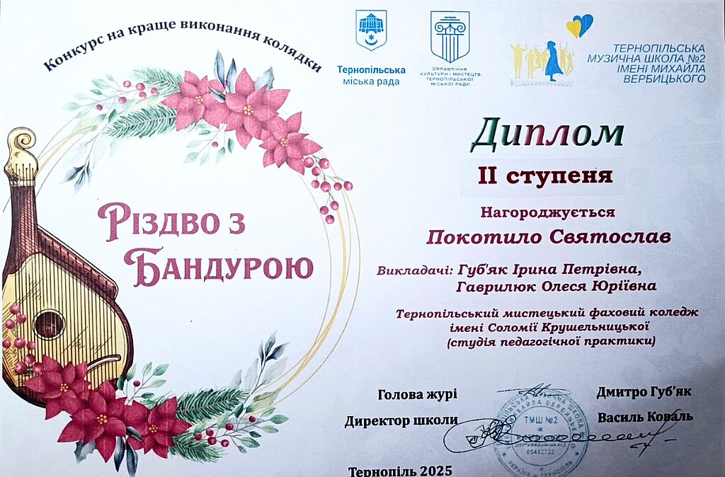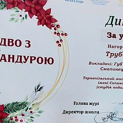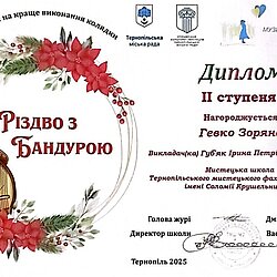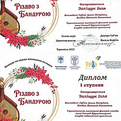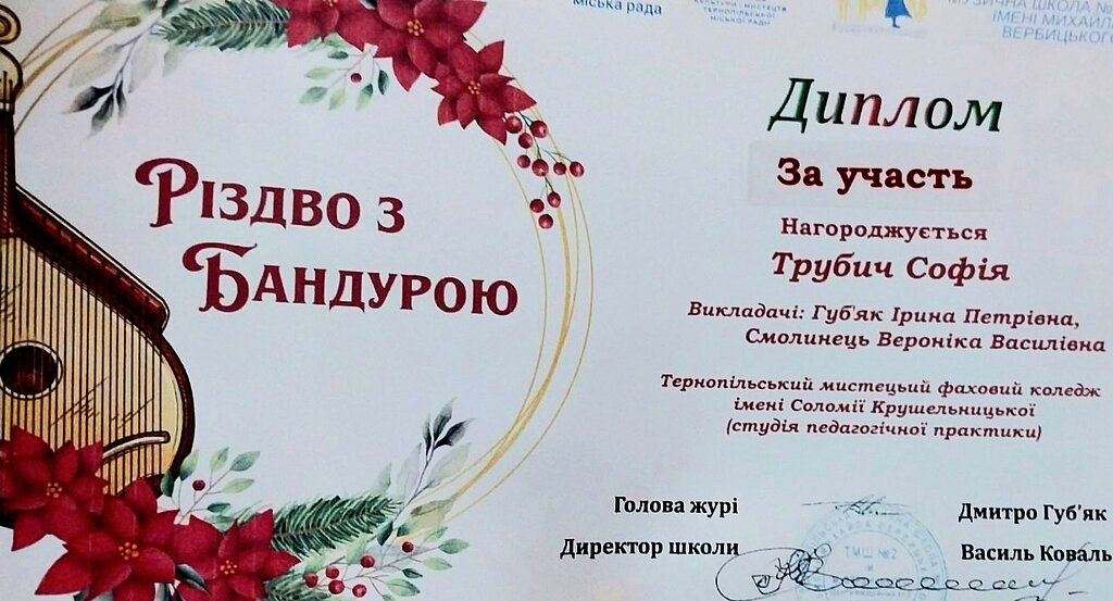 Вихованці школи-студії педагогічної практики та учениця мистецької школи Тернопільського мистецького фахового коледжу імені Соломії Крушельницької отримали призові місця на конкурсі "Різдво з бандурою", який відбувався у Тернополі.