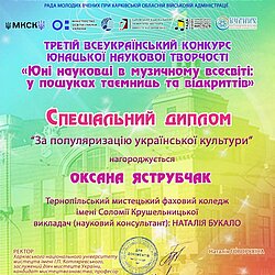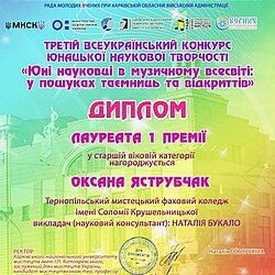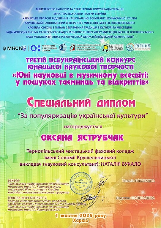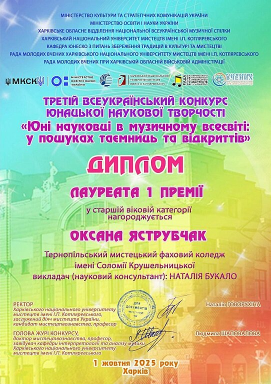 Оксана Яструбчак, четвертокурсниця відділу "Теорія музики" Тернопільського мистецького фахового коледжу імені Соломії Крушельницької, стала лауреатом першої премії на ІІІ Всеукраїнському конкурсі юнацької наукової творчості "Юні науковці в музичному Всесвіті: у пошуках таємниць та відкриттів".