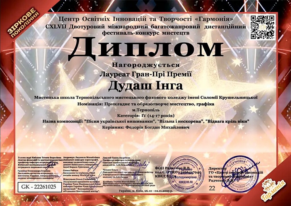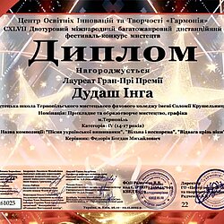 Інга Дудаш, учениця мистецької школи Тернопільського мистецького фахового коледжу імені Соломії Крушельницької, стала володаркою Гран-прі CXLVII двотурового міжнародного багатожанрового дистанційного фестиваль-конкурсу мистецтв "Зіркове покоління".