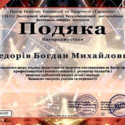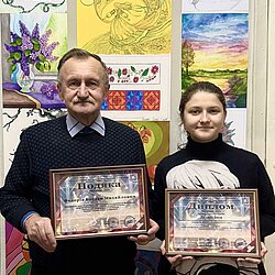 Юна художниця отримала диплом лауреата, а її наставник художник, викладач мистецької школи Богдан Федорів — подяку за працю, професіоналізм і компетентність у розвитку талантів і творчих здібностей дітей і молоді!